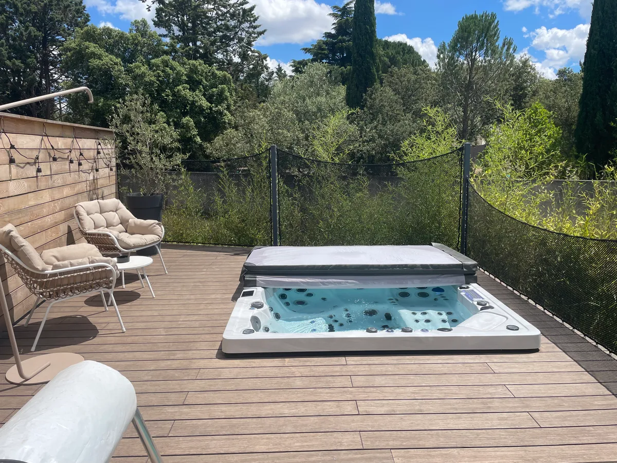 Un extérieur soigné et convivial pour profiter pleinement des beaux jours. Terrasse équipée avec salon de jardin, barbecue et plancha pour vos repas en plein air. Piscine sécurisée par une barrière, jacuzzi chauffé pour se détendre en toute saison. Ambiance lumineuse en soirée, idéale pour prolonger les moments partagés. Terrain de pétanque à disposition pour des parties entre amis ou en famille.